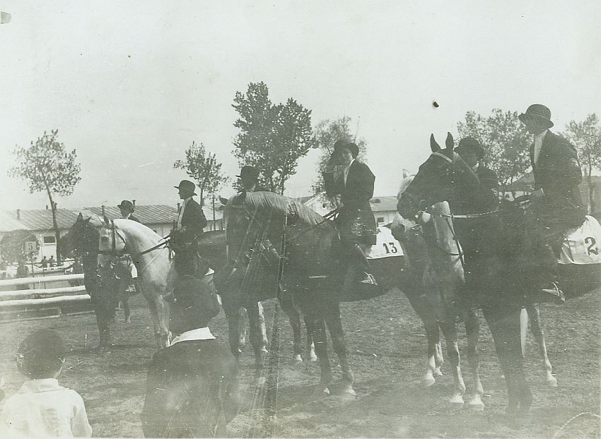 | Nr. inwentarzowy: MŁJ-XVI 1744 / 00 / 055 opis: Konkurs Klubu Sportowego Rodziny Wojskowej, rozdanie nagród. Plac konkursowy, w głębi przeszkoda, kibice, drzewa, budynki. W szeregu 6 amazonek konno (meloniki, ciemne fraki), wśród nich zwyciężczyni Zofia Sikorska na siwym koniu Łaskawy Pan. Na jasnych potnikach numery. Z przodu 2 chłopców.czas powstania - daty graniczne: 1931-05-14 - 1931-05-14miejsce: Warszawa, ujeżdżalnia Szwadronu Sztabowegoosoby: Zofia [Zofja, Zosia] Sikorska (1912-1943) - druga z prawej lub druga z lewej (na siwym koniu). Później żona inż. Stanisława Leśniowskiego. Zginęła w katastrofie gibraltarskiej lub zaginęła w 1943 r.tworzywo: papier fotograficzny, błyszczącytechnika: odbitka żelatynowo-srebrowa DOP, czarno-białazespół: album rodziny Leskichwymiary (wys. x szer.): 89 x 119 [mm] Koń: 1. Łaskawy Pan, wałach, maść siwa, ur. 1919 - hod. nieznana, wł. Zofja Sikorska
