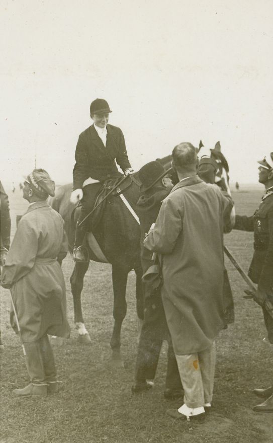 | Nr. inwentarzowy: MŁJ-XVI 1641 / 00 / 013 opis: Zawody organizowane przez Komitet Targów Końskich w Gnieźnie, wręczanie nagród. Plac konkursowy - na stojącym koniu Morus R. Brökere w ciemnym stroju jeździeckim. Widać jasny napierśnik. Przed koniem stoi 2 oficerów i 2 cywili - jeden (ciemny płaszcz, melonik) wpina wstęgę honorową, drugi ma na butach kamasze.czas powstania - daty graniczne: 1934-05-03 - 1934-05-03miejsce: Gniezno, hipodrom Komitetu Targów Końskich w Gnieźnieosoby: Romana (Roma) Brökere(1909-2001, ze Strumian, później Daszkowska)inne nazwy własne: Konkurs parami Imienia JWPana Prezydenta Poznańskiego Ziemstwa Kredytowego Józefa Żychlińskiego w Poznaniu, wys. ok. 100 cm, szer. do 250 cmtworzywo: papier fotograficzny, półbłyszczącytechnika: odbitka żelatynowo-srebrowa DOP, czarno-białazespół: album rodziny Brökerewymiary (wys. x szer.): 139 x 89 [mm] Koń: 1. Morus, wałach, maść kasztanowata - hod. nieznana, wł. płk. Brabec