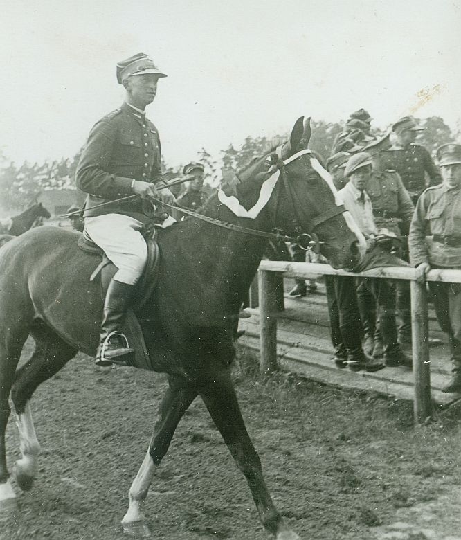 | Nr. inwentarzowy: MŁJ-XVI 1758 / 00 / 054 opis: Tor wyścigów konnych, zawody konne - konkurs ujeżdżenia. Rtm. Michał Bohdanowicz na koniu Talar (4. m.) wraca po dekoracji. Koń w rzędzie sportowym (skoki) - ogłowie wędzidłowe z nachrapnikiem polskim i wpiętą wstęgą honorową. Zawodnik w mundurze i jasnych bryczesach. Za ogrodzeniem, na podeście z desek publiczność. Wygrał por. Wacław Totjew na koniu czas powstania - daty graniczne: 1935-07-14 - 1935-07-14miejsce: Wilno, Pośpieszkaosoby: Rtm. Michał Bohdanowicz 1903-1948 ("Miś", syn Jana Bohdanowicza i Marii z Cywińskich. W latach 1932-1936 w 4 Pułku Ułanów Zaniemeńskich); niewidoczny: Rtm. Wacław Totjew / Wassan Bek Totjew 1894-1939 (1926 w 3 p.s.k.; kursy w Grudziądzu – 1927 doszkalający, 1928-29 – instruktorski; 1934 K.O.P. 1936 – rtm., 1939 23 p.u., zginął 21 września. Wszechstronny jeździec, największe sukcesy w Konnych MWP).inne nazwy własne: Konne MWP - Konne Mistrzostwa Wojska Polskiego - Militari. K.O.P. - Korpus Ochrony Pogranicza.tworzywo: papier fotograficzny, błyszczącytechnika: odbitka żelatynowo-srebrowa DOP, czarno-białazespół: album rodziny Bohdanowiczówwymiary (wys. x szer.): 100 x 85 [mm] Konie: 1. Talar III, wałach, maść kasztanowata - hod. Bogumiła Hebanowskiego; ur. przed 1928, prywatny koń Michała Bohdanowicza, który startował na nim w konkursach ujeżdżenia, skoków (np. Mitingi Popularne PZJ 1938-39 i WKKW ("Militari"), biegach myśliwskich, skiringu, uczestniczył w ćwiczeniach wojskowych. Dosiadała go też żona Michała - Wanda (m.in. w 1937 r. w Grudziądzu).., na zdjęciu: 4. miejsce 2. Trop - także Trop II, startował w 2. poł. l. 30. XX w. pod por./rtm. W.. Totjewem w ujeżdżeniu i skokach., na zdjęciu: nie ma go na zdjęciu, 1. miejsce
