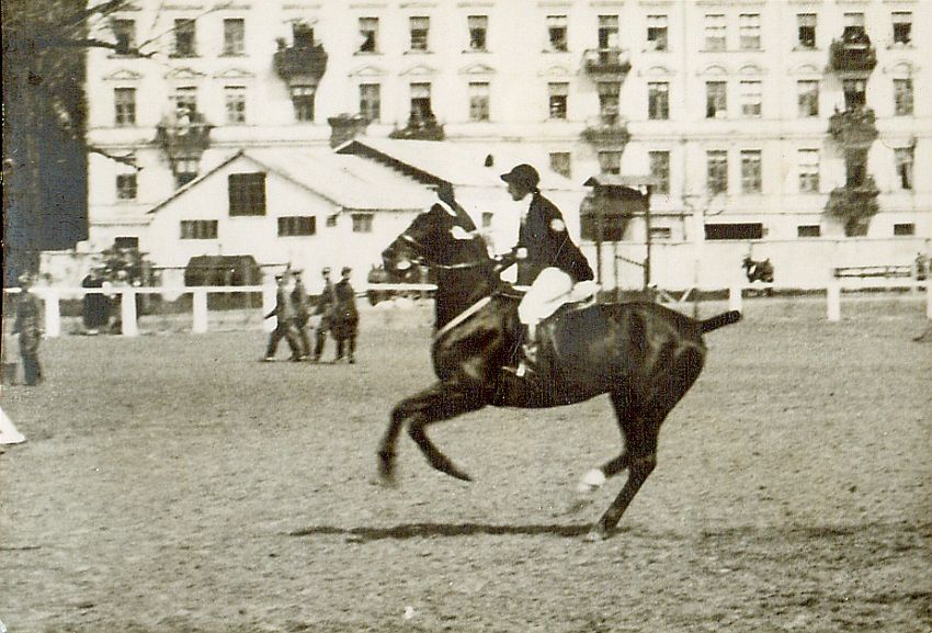 | Nr. inwentarzowy: MŁJ-XVI 1756 / 01 / 002 opis: Konkurs Klubu Sportowego Rodziny Wojskowej w Szwadronie Sztabowym. Anna Leska na koniu Neptun - galop na parkurze. W tle, na balkonach sąsiedniego budynku, publiczność. Leska i Neptun zdobyli II nagrodę.czas powstania - daty graniczne: 1933-05-14 - 1933-05-14miejsce: Warszawa, ujeżdżalnia Szwadronu Sztabowegoosoby: Anna Leska 1910-1998 ("Anka", członkini K.S.R.W.; później Leska-Daab, podczas II wojny światowej pilot w Wielkiej Brytanii).inne nazwy własne: K.S.R.W.tworzywo: papier fotograficzny, błyszczącytechnika: odbitka żelatynowo-srebrowa DOP, czarno-białazespół: album rodziny Bohdanowiczówwymiary (wys. x szer.): 54 x 79 [mm] Koń: 1. Neptun, wałach - koń z kurtyzowanym ogonem, na którym w 1933 r. startowała Anna Leska