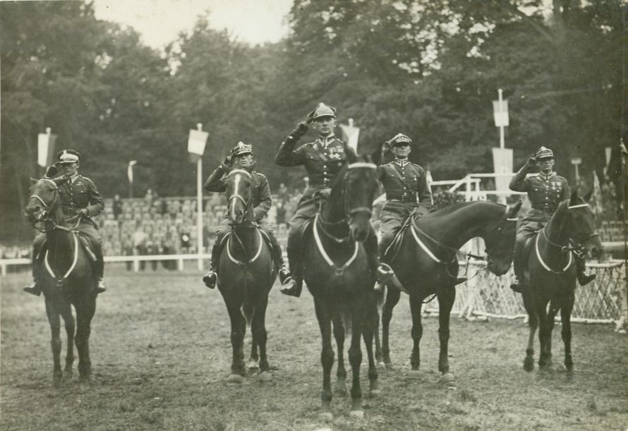 | Nr. inwentarzowy: MŁJ-XVI 1603 / 00 / 006 opis: Międzynarodowe Konkursy Hipiczne - ekipa Polski podczas prezentacji (jeźdźcy na koniach, salutują): mjr M. Antoniewicz na Banzaj, por. K. Gzowski na Mylord, por. H. Roycewicz na Black Boy, por. Wł. Zgorzelski na Ładna, szef ekipy, trener ppłk K. Rómmel.data: podano czas trwania zawodówczas powstania - daty graniczne: 1928-09-16 - 1928-09-26miejsce: Warszawa, hipodrom w Łazienkachosoby: mjr Michał Woysym-Antoniewicz, por. Kazimierz Gzowski, por. Henryk Leliwa-Roycewicz, por. Władysław Zgorzelski, szef ekipy trener ppłk Karol Rómmeltworzywo: papier fotograficzny, błyszczącytechnika: odbitka żelatynowo-srebrowa DOP, czarno-białawymiary (wys. x szer.): 122 x 172 [mm] Konie: 1. Banzaj, wałach 2. Black Boy, wałach, maść kara, ur. 1922 - import z Irlandii, wł. H. Roycewicza, który startował na nim na przełomie l. 20. i 30., w 1928 r. w ekipie, która zdobyła w Warszawie Puchar Narodów 3. Ładna, klacz 4. Mylord, wałach - wł. kpt. Szilagyi, imp. z Irlandii, IO w 1928 w Amsterdamie - skoki (zesp. srebro, ind. 4/5 m.)