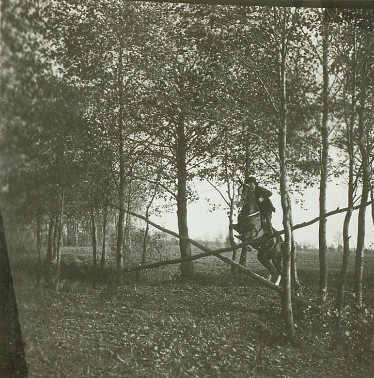 | Nr. inwentarzowy: MŁJ-XVI 1743 / 00 / 066 opis: Przez kopertę z 2 drągów, zbudowaną w lasku skacze na koniu Mandaryn Janina Słaboszewiczówna. Amazonka w ciemnym stroju. Widok z przodu, lekko z ukosa.czas powstania - daty graniczne: 1930-10-01 - 1930-10-31miejsce: Majątek Słaboszewiczów - Ostrowiec koło Wołominaosoby: Janina [Nina, Ninula] Kirn-Słaboszewicz, po mężu Lipkowska (1910-1975)tworzywo: papier fotograficzny, błyszczącytechnika: odbitka żelatynowo-srebrowa DOP, czarno-białazespół: album rodziny Leskichwymiary (wys. x szer.): 59 x 60 [mm] Koń: 1. Mandaryn, wałach, maść kasztanowata, ur. 1920 - hod. NN, wł. Niny Słaboszewicz; oprócz właścicielki dosiadała go Anna Leska