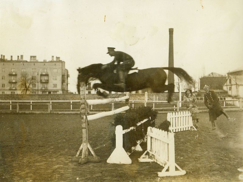 | Nr. inwentarzowy: MŁJ-XVI 1757 / 00 / 012 opis: Por. Tadeusz Sokołowski w skoku przez przeszkodę - triple-barre z płotkami - odkosami na koniu Zator. Przy przeszkodzie stoją Wanda i Michał Bohdanowiczowie - "pomagają" w skoku charakterystycznie unosząc nogi.data: kwiecień 1934 r.czas powstania - daty graniczne: 1934-04-01 - 1934-04-30miejsce: Warszawa, ujeżdżalnia 1 Pułku Szwoleżerów Józefa piłsudskiegoosoby: Por. Tadeusz Sokołowski 1905-1943 (1 p.sz., jeździec klasy międzynarodowej, późniejszy olimpijczyk z Berlina, zamordowany przez Gestapo w Mińsku); Wanda Bohdanowicz zd. Leska 1908-1991 (córka Juliusza Leskiego i Marii zd. Olszyńskiej); por. Michał Bohdanowicz 1903-1948 (w latach 1932-1936 służył w 4 Pułku Ułanów Zaniemeńskich w Wilnie, wcześniej w 9 p.s.k.). tworzywo: papier fotograficzny, błyszczącytechnika: odbitka żelatynowo-srebrowa DOP, tonowana?zespół: album rodziny Bohdanowiczówwymiary (wys. x szer.): 83 x 110 [mm] Koń: 1. Zator, wałach, ur. 1927 - po Przedświt II i Oaza, hod. Kraśnicki, w 1. poł. l. 30. XX w. startował na nim głównie por. T. Sokołowski, w ujeżdżeniu i skokach, m.in. podczas warszawskich konkursów w Łazienkach