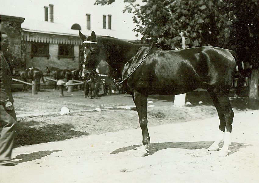 | Nr. inwentarzowy: MŁJ-XVI 1754 / 04 / 016 opis: Portret konia Ostry. Koń w ogłowiu z nachrapnikiem polskim stoi na drodze lub skraju placu. Wodze zarzucone na szyję. Przed koniem fragment sylwetki mężczyzny w jasnym garniturze. W tle konie przy koniowiązach, zabudowania koszarowe, stajnie.data: maj 1932 r.czas powstania - daty graniczne: 1932-05-01 - 1932-05-31miejsce: Warszawa, ujeżdżalnia 1 Dywizjonu Artylerii Konnejtworzywo: papier fotograficzny, błyszczącytechnika: odbitka żelatynowo-srebrowa DOP, czarno-białazespół: album rodziny Bohdanowiczówwymiary (wys. x szer.): 88 x 118 [mm] Koń: 1. Ostry, wałach - imp. z Węgier; koń, na którym startowali w konkursach skoków Włodzimierz Korytkowski (m.in. Warszawa, Nicea), Wanda Leska (m.in. Warszawa), Michał Bohdanowicz