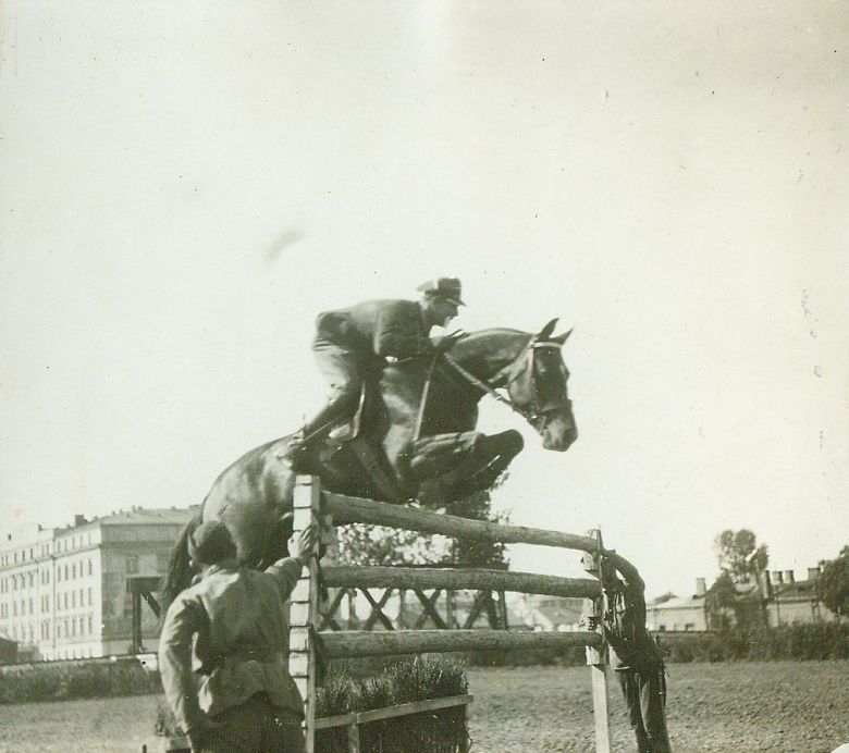 | Nr. inwentarzowy: MŁJ-XVI 1753 / 00 / 074 opis: Rtm. Wilhelm Lewicki na koniu Olaf w treningowym skoku przez bardzo wysoką stacjonatę ze wskazówką - płotkiem. Przy przeszkodzie stoją dwaj żołnierze i trzymają stojaki na wysokości górnego drąga. W tle widać m.in. okazały gmach i stalową konstrukcję przęsła.data: wrzesień 1929 r.czas powstania - daty graniczne: 1929-09-01 - 1929-09-30miejsce: Warszawa, ul. Koszykowa 79, Wyższa Szkoła Wojenna, ujeżdżalniaosoby: Rtm. Wilhelm Rogala-Lewicki 1898-1992 Londyn ("Wil", jeździec klasy międzynarodowej, w 1929 r. reprezentował w konkursach W.S.W. - był w niej głównym instruktorem jazdy konnej)inne nazwy własne: W.S.W - WSW - W.S.Woj. - Wyższa Szkoła Wojennatworzywo: papier fotograficzny, błyszczącytechnika: odbitka żelatynowo-srebrowa DOP, czarno-białazespół: album rodziny Bohdanowiczówwymiary (wys. x szer.): 78 x 86 [mm] Koń: 1. Olaf, wałach, rasa: wsch. pr., maść kasztanowata, ur. 1921 - Tausch i Alfreda, hod. Wawrzyniak, wł. M.S.Wojsk., CWK; startował pod W. Lewickim, K. Szoslandem, S. Kuleszą, pod R. Pohoreckim występował w Nicei i zdobył MP w skokach w 1933 roku