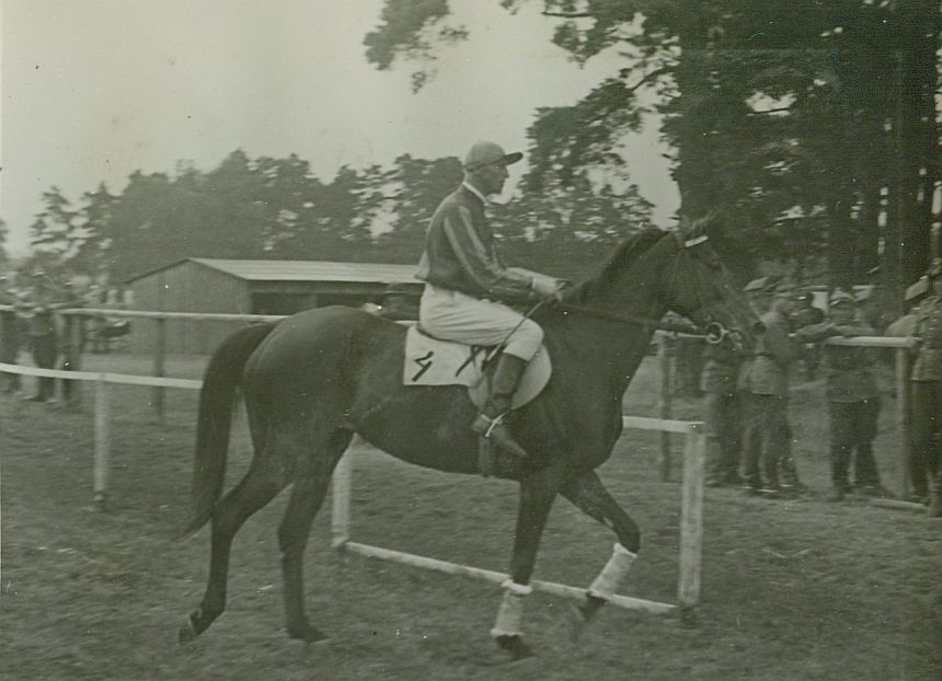 | Nr. inwentarzowy: MŁJ-XVI 1746 / 00 / 062 opis: Tor wyścigów konnych, gonitwa im. 1 Dywizji Piechoty Legjonowej (pisownia oryginalna). Michał Bohdanowicz (białe bryczesy, ciemna kurtka z podłużnymi pasami na rękawach, jasna czapka) na koniu Ixora zjeżdża kłusem z toru po wygraniu wyścigu. Na potniku numer 4, koń z zabandażowanymi przednimi nogami. W tle bariera, ogrodzenie, publiczność,drzewa.czas powstania - daty graniczne: 1936-07-12 - 1936-07-12miejsce: Wilno, Pośpieszka.osoby: Rtm. Michał Bohdanowicz "Miś" (1903-1948), 13 p.u., dowódca 1 szwadronu "Tatarskiego".tworzywo: papier fotograficzny, błyszczącytechnika: odbitka żelatynowo-srebrowa DOP, czarno-białazespół: album rodziny Leskichwymiary (wys. x szer.): 84 x 113 [mm] Koń: 1. Ixora, klacz, rasa: xx - koń, na którym w steeple-chase i gonitwach płotowych startowali M. Bohdanowicz i H. Dobrzański.