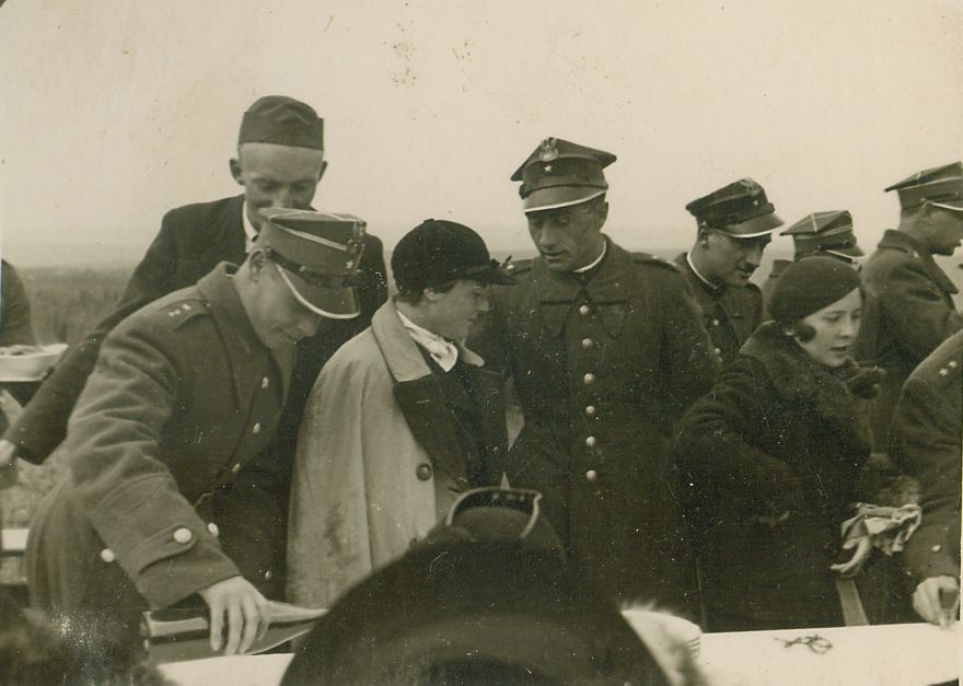 | Nr. inwentarzowy: MŁJ-XVI 1628 / 00 / 048 opis: Poczęstunek po biegu. Przy przykrytym białym obrusem stole na świeżym powietrzu stoją od lewej: oficer z butelką nalewający "strzemiennego", z tyłu hr. Andrzej Potocki, obok (w jasnym płaszczu) Jadwiga Grotthus, przy niej ppor. Jan Kostrzewa, kobieta w ciemnym płaszczu, oficerowie.data: 2. poł. l. 30. XX w.czas powstania - daty graniczne: 1935-03-01 - 1939-08-31miejsce: okolice Hrubieszowa lub Włodzimierza Wołyńskiegoosoby: hr. Andrzej Potocki, Jadwiga Grotthus (1920-2011) - córka Gustawa i Anny zd. Chłapowskiej, ppor. Jan Kostrzewa (27 p.a.l.)inne nazwy własne: 27 Pułk Artylerii Lekkiejtworzywo: papier fotograficzny, półbłyszczący, Agfa-Gevaerttechnika: odbitka żelatynowo-srebrowa DOP, czarno-białazespół: album rodziny Grotthuswymiary (wys. x szer.): 65 x 86 [mm]