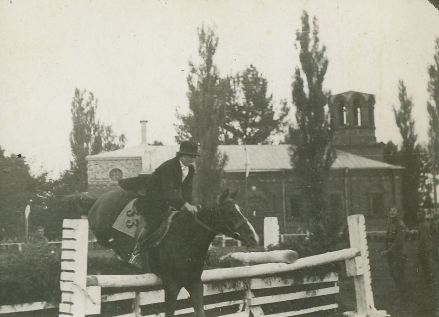 | Nr. inwentarzowy: MŁJ-XVI 1628 / 00 / 053 opis: Kobieta w meloniku, ciemnym fraku, bryczesach i długich butach skacze na koniu ciemnej maści przez okser z płotka wypełnionego jedliną i jasnego drąga. Na przeszkodzie ułożony ukośnie drąg, na potniku nr 33. W tle budynek z charakterystyczną wieżą, drzewa.data: 2. poł. l. 30. XX w.czas powstania - daty graniczne: 1935-03-01 - 1939-08-31miejsce: Hrubieszów lub okoliceinne nazwy własne: Hrubieszowski Klub Jeździecki, 2 Pułk Strzelców Konnych - organizatorzy imprez jeździeckichtworzywo: papier fotograficzny, błyszczącytechnika: odbitka żelatynowo-srebrowa DOP, czarno-białazespół: album rodziny Grotthuswymiary (wys. x szer.): 68 x 87 [mm]