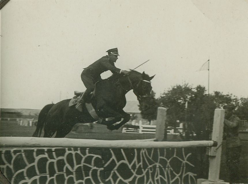 | Nr. inwentarzowy: MŁJ-XVI 1628 / 00 / 039 opis: Oficer (kpt.Wieruszewski?) skacze na koniu ciemnej maści przez okser z murka i jasnego drąga. Na jasnym potniku numer 8. Obok przeszkody stoi żołnierz; w tle inne przeszkody, drzewa, zabudowania.data: 2. poł. l. 30. XX w.czas powstania - daty graniczne: 1935-03-01 - 1939-08-31miejsce: Hrubieszów lub okoliceosoby: niewyraźny opis: kpt. [kpt.] Wieruszewski(?) z 27 palinne nazwy własne: Hrubieszowski Klub Jeździecki, 2 Pułk Strzelców Konnych - organizatorzy imprez jeździeckichtworzywo: papier fotograficzny, błyszczącytechnika: odbitka żelatynowo-srebrowa DOP, czarno-białazespół: album rodziny Grotthuswymiary (wys. x szer.): 67 x 86 [mm]
