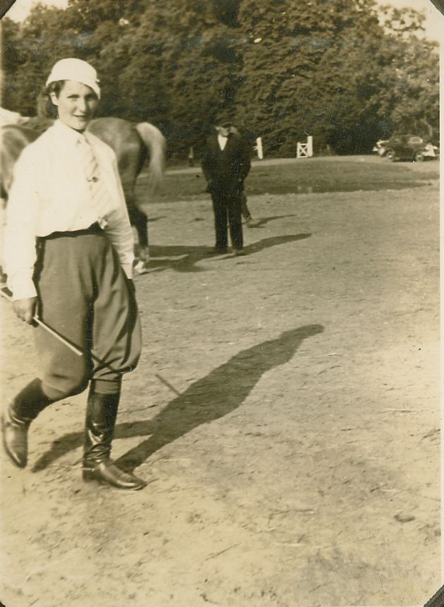 | Nr. inwentarzowy: MŁJ-XVI 1628 / 00 / 011 opis: Rajd konny Hrubieszów-Trzeszczany(?), Anna Jurkowska przechadza się w nieoficjalnym stroju jeździeckim. Idzie przez plac w jasnej czapce i bluzce, bryczesach, długich butach i z palcatem w ręce. W tle mężczyzna w ciemnym stroju, koń, drzewa.data: powyżej data rajdu, na pewno 2. poł. l. 30. XX w.czas powstania - daty graniczne: 1936-05-15 - 1936-05-31miejsce: okolice Hrubieszowaosoby: Anna Jurkowska, żona por. Leona Jurkowskiegoinne nazwy własne: Hrubieszowski Klub Jeździecki, 2 Pułk Strzelców Konnych - organizatorzy rajdutworzywo: papier fotograficzny, półbłyszczący, Agfa-Gevaerttechnika: odbitka żelatynowo-srebrowa DOP, czarno-białaautor: Lebensztein A.zaklad: FOTO-FILM, A. Lebensztein, Hrubieszów, ul. 3 Majazespół: album rodziny Grotthuswymiary (wys. x szer.): 86 x 65 [mm]