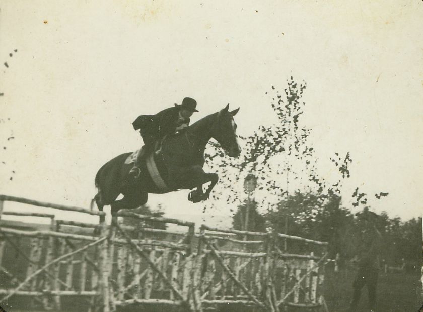 | Nr. inwentarzowy: MŁJ-XVI 1628 / 00 / 019 opis: Zawody w skokach przez przeszkody, Maria Kraińska w skoku. Amazonka w ciemnym stroju jeździeckim, na głowie melonik, pokonuje konno przeszkodę z brzozowych gałęzi, z boku stoi żołnierz.data: 2. poł. l. 30. XX w.czas powstania - daty graniczne: 1935-03-01 - 1939-08-31miejsce: Hrubieszówosoby: Maria Kraińska (1916-2002)tworzywo: papier fotograficzny, półbłyszczącytechnika: odbitka żelatynowo-srebrowa DOP, czarno-białazespół: album rodziny Grotthuswymiary (wys. x szer.): 68 x 86 [mm]