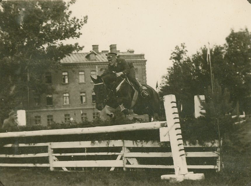 | Nr. inwentarzowy: MŁJ-XVI 1628 / 00 / 052 opis: oficer (okrągła czapka) skacze na koniu ciemnej maści przez okser z płotka wypełnionego jedliną i jasnego drąga, w tle budynek i drzewadata: 2. poł. l. 30. XX w.czas powstania - daty graniczne: 1935-03-01 - 1939-08-31miejsce: Hrubieszów lub okoliceinne nazwy własne: Hrubieszowski Klub Jeździecki, 2 Pułk Strzelców Konnych - organizatorzy imprez jeździeckichtworzywo: papier fotograficzny, błyszczącytechnika: odbitka żelatynowo-srebrowa DOP, czarno-białazespół: album rodziny Grotthuswymiary (wys. x szer.): 67 x 87 [mm]