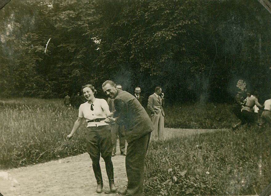 | Nr. inwentarzowy: MŁJ-XVI 1628 / 00 / 046 opis: Fotografowanie. Na drodze kilka osób, na pierwszym planie uśmiechnięty mężczyzna w garniturze ciągnie za rękę Marię Kraińską (jasna bluzka, bryczesy i długie buty) przed aparat fotograficzny. Z tyłu 3 cywile patrzą na oficerów "ścigających" inne damy. W głębi drzewa, po bokach uprawy.data: 2. poł. l. 30. XX w.czas powstania - daty graniczne: 1935-03-01 - 1939-08-31miejsce: Hrubieszów lub okoliceosoby: Maria Kraińska (1916-2002)tworzywo: papier fotograficzny, półbłyszczącytechnika: odbitka żelatynowo-srebrowa DOP, czarno-białazespół: album rodziny Grotthuswymiary (wys. x szer.): 63 x 84 [mm]