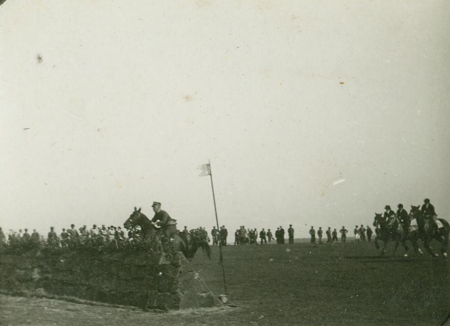 | Nr. inwentarzowy: MŁJ-XVI 1628 / 00 / 057 opis: bieg na przełaj, rozległa łąka - przed pochyłą przeszkodą odbija się koń ciemnej maści - jeździec w mundurze, w pewnej odległości 3 kolejne konie, prawdopodobnie pod amazonkami, w głębi szereg kibicówdata: 2. poł. l. 30. XX w.czas powstania - daty graniczne: 1935-03-01 - 1939-08-31miejsce: Hrubieszów lub okolicetworzywo: papier fotograficzny, błyszczącytechnika: odbitka żelatynowo-srebrowa DOP, czarno-białazespół: album rodziny Grotthuswymiary (wys. x szer.): 67 x 87 [mm]
