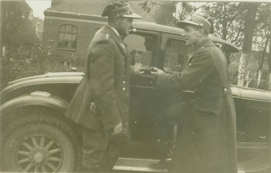 | Nr. inwentarzowy: MŁJ-XVI 1519 / 00 / 058 opis: C.W.K., Dwóch oficerów stoi na tle budynku przy samochodzie; z prawej por. Janusz Komorowski 1 p.u.data: 1. poł. l. 30. XX w., po powołaniu na KIJK, jesieńczas powstania - daty graniczne: 1931-10-15 - 1935-11-30miejsce: Polska, Grudziądz, C.W.K. [Centrum Wyszkolenia Kawalerii]osoby: por. Janusz Komorowski (1905-1993), 1 p.u., uczestnik IX KIJK 1931-32 i III WKIJK 1932-33; wybitny jeździec - skoczek w l. 30., jedyny polski skoczek, kt. ukończył parkur na IO w 1936 r.; 19 x PN, w tym 5 zwycięstwinne nazwy własne: IX Kurs Instruktorów Jazdy Konnej 15.10.1931 – 15.08.1932tworzywo: papier fotograficzny, półmatowytechnika: odbitka żelatynowo-srebrowa DOP, czarno-białazespół: album rodziny Nieniewskichwymiary (wys. x szer.): 56 x 85 [mm]