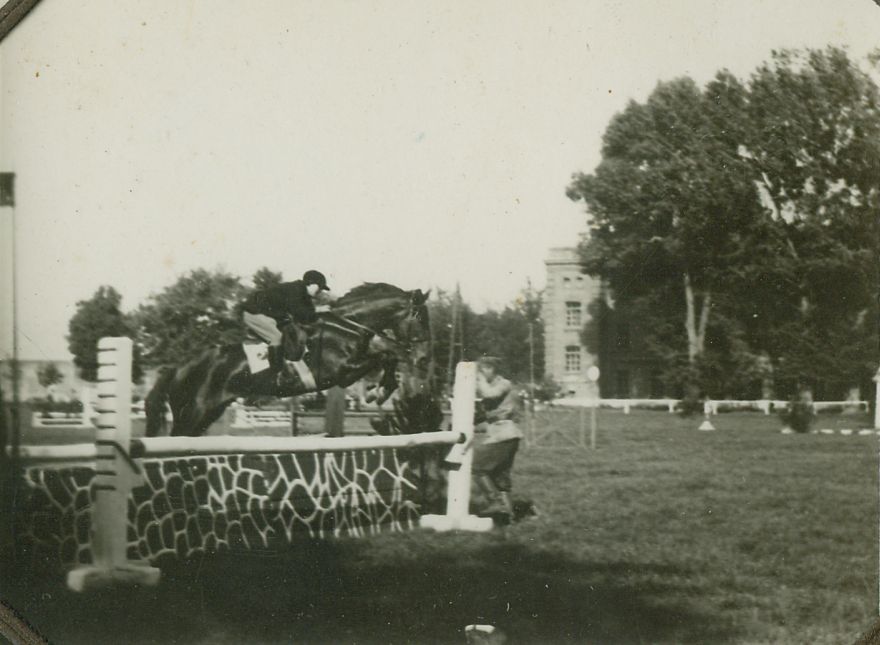 | Nr. inwentarzowy: MŁJ-XVI 1628 / 00 / 037 opis: Jadwiga Grotthus we fraku, jasnych bryczesach i toczku skacze na koniu ciemnej maści przez okser z murka i jasnego drąga. Na białym potniku słabo widoczny numer - 3 lub 5? W tle inne przeszkody, drzewa, skraj reprezentacyjnego gmachu.data: 2. poł. l. 30. XX w.czas powstania - daty graniczne: 1935-03-01 - 1939-08-31miejsce: Hrubieszów lub okoliceosoby: Jadwiga Grotthus (1920-2011), córka Gustawa i Anny zd. Chłapowskiejinne nazwy własne: Hrubieszowski Klub Jeździecki, 2 Pułk Strzelców Konnych - organizatorzy imprez jeździeckichtworzywo: papier fotograficzny, błyszczącytechnika: odbitka żelatynowo-srebrowa DOP, czarno-białazespół: album rodziny Grotthuswymiary (wys. x szer.): 63 x 83 [mm]