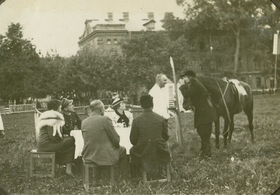 | Nr. inwentarzowy: MŁJ-XVI 1628 / 00 / 033 opis: Na trawiastym placu przed dużym, reprezentacyjnym gmachem siedzą przy stole na taboretach: 2 panie, oficer, chłopiec i 2 cywili. Barbara Grotthus (ciemny strój jeździecki) pije kruszon z koniem w ręku, obok stoi mężczyzna w jasnej koszuli.data: 2. poł. l. 30. XX w.czas powstania - daty graniczne: 1935-03-01 - 1939-08-31miejsce: Hrubieszów lub okoliceosoby: Barbara Grotthus (1917-1999), córka Gustawa i Anny zd. Chłapowskiejinne nazwy własne: Hrubieszowski Klub Jeździecki, 2 Pułk Strzelców Konnych - organizatorzy imprez jeździeckichtworzywo: papier fotograficzny, błyszczącytechnika: odbitka żelatynowo-srebrowa DOP, czarno-białazespół: album rodziny Grotthuswymiary (wys. x szer.): 63 x 86 [mm]