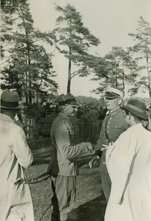| Nr. inwentarzowy: MŁJ-XVI 1758 / 00 / 012 opis: Tor wyścigów konnych. Rozmowa wyścigowych bywalców, od lewej stoją: mężczyzna w jasnym płaszczu i kapeluszu, por. Jan Goszczyński, płk Juliusz Kleeberg, Wanda Bohdanowicz.czas powstania - daty graniczne: 1935-06-30 - 1935-07-21miejsce: Wilno, Pośpieszkaosoby: Por. Jan Goszczyński ur. 1896 (5 DAK, właściciel stajni wyścigowej, trener i jeździec wyścigowy); płk dypl. Juliusz Kleeberg 1890-1970 (dow. 6 SBK w Stanisławowie 1930-1939); Wanda Bohdanowicz zd. Leska 1908-1991 (żona M. Bohdanowicza).tworzywo: papier fotograficzny, błyszczącytechnika: odbitka żelatynowo-srebrowa DOP, czarno-białazespół: album rodziny Bohdanowiczówwymiary (wys. x szer.): 125 x 86 [mm]
