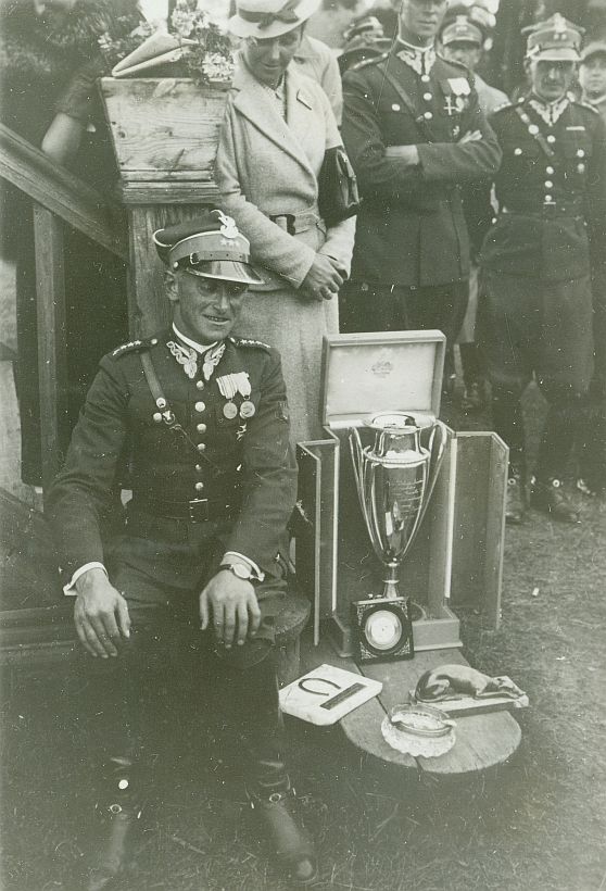 | Nr. inwentarzowy: MŁJ-XVI 1758 / 00 / 069 opis: Tor wyścigów konnych, rtm. Michał Bohdanowicz z nagrodami zdobytymi 14 lipca - dosiadając kolejno pięciu koni, odniósł pięć zwycięstw: puchar, zegar(?), plakieta z podkową, kryształowa popielniczka, rzeźba przedstawiająca leżącego charta. Rotmistrz w mundurze siedzi na dolnych stponiach trybuny. Za nim publiczność, w pierwszym rzędzie żona Wanda Bohdanowicz (w jasnym kostiumie i kapeluszu) i dwóch oficerów.czas powstania - daty graniczne: 1935-07-14 - 1935-07-14miejsce: Wilno, Pośpieszkaosoby: Rtm. Michał Bohdanowicz 1903-1948 (w l. 1932-1936 i przed II wojną w 4 Pułku Ułanów Zaniemeńskich, nazywany "Misiem"; miłośnik wyścigów płotowych, przeszkodowych i biegów na przełaj, właściciel stajni wyścigowej, mąż Wandy); Wanda Bohdanowicz zd. Leska 1908-1991 (córka Juliusza Leskiego i Marii zd. Olszyńskiej, żona Michała Bohdanowicza).tworzywo: papier fotograficzny, błyszczącytechnika: odbitka żelatynowo-srebrowa DOP, czarno-białazespół: album rodziny Bohdanowiczówwymiary (wys. x szer.): 124 x 85 [mm]
