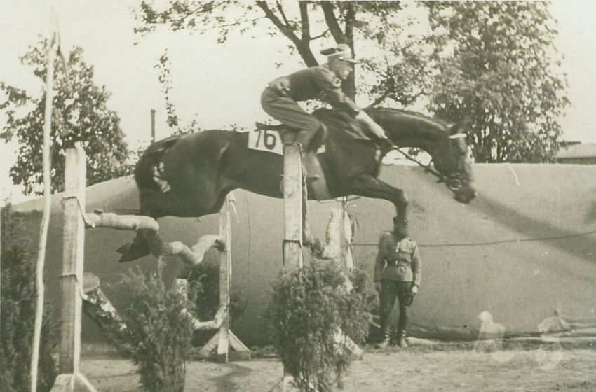 opis: por. Janusz Komorowski 1 p.u., skok przez okser z malowniczo wygiętych drągów; na potniku nr 16