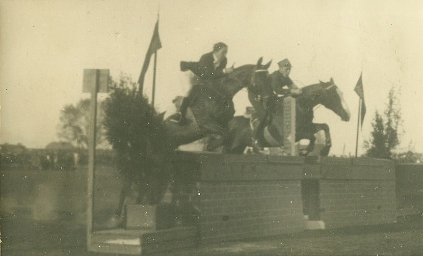| Nr. inwentarzowy: MŁJ-XVI 1760 / 00 / 060 opis: Konkursy hipiczne w Gnieźnie - Konkurs Parami, zwykły. W równoległym skoku przez mur: Wanda Bohdanowicz (strój konkursowy, goła głowa) na koniu Kazik i por. Janusz Komorowski (w mundurze) na koniu Zbój IV. Para zdobyła wstęgę honorową. Widać proporczyki ograniczające przeszkodę, stojak dzielący mur w połowie, rośliny w donicach, tabliczkę z numerem (tyłem).data: dzień rozegrania konkursu paramiczas powstania - daty graniczne: 1937-05-03 - 1937-05-03miejsce: Gnieznoosoby: Wanda Bohdanowicz 1908-1991 (z domu Leska, córka Juliusza Leskiego i Marii zd. Olszyńskiej, siostra Anny i Kazimierza, żona Michała Bohdanowicza, miłośniczka sportów konnych, wyścigów); por. Janusz Komorowski 1905-1993 (1 p.u., wybitny jeździec - skoczek, olimpijczyk z 1936 r., trener, w kampanii wrześniowej trafił do niewoli, walczył w armii gen. Andersa, wieloletnia emigracja w Argentynie).tworzywo: papier fotograficzny, półbłyszczącytechnika: odbitka żelatynowo-srebrowa DOP, tonowana?zespół: album rodziny Bohdanowiczówwymiary (wys. x szer.): 81 x 130 [mm] Konie: 1. Kazik, wałach, maść skarogniada, ur. 1925 - Rock-Roy – Merilla, hod. H. Jechalskiego, wł. Wandy Leskiej-Bohdanowicz; w 1930 roku właścicielka trenowała go na ujeżdżalni W.S.Woj., startowała na nim m.in. w Warszawie, podczas Krajowych Zawodów Konnych w 1932 r.; w 1933 r. wygrywali na nim biegi przełajowe M. Bohdanowicz i J. Domański. W 1937 r. startował w Grudziądzu i Gnieźnie, na zdjęciu: z lewej 2. Zbój IV, wałach, maść kasztanowata, ur. 1928 - hod. hr. Witold Łoś, Piotrowice, wł. M.S.Wojsk., startował pod J. Komorowskim w 2. poł. l. 30. w konkursach krajowych i międzynarodowych (m.in.: Warszawa, Grudziądz, Nicea, Insterburg), na zdjęciu: z prawej