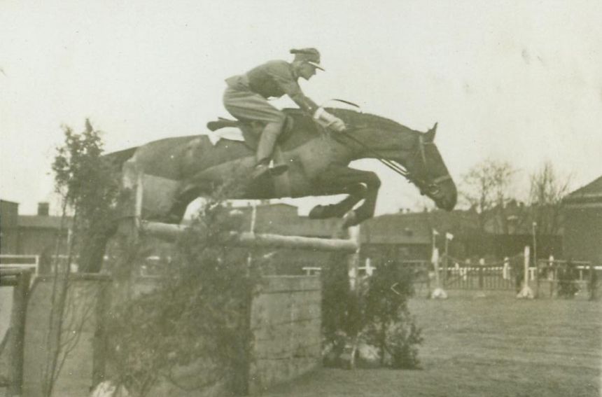 | Nr. inwentarzowy: MŁJ-XVI 1517 / 00 / 002 opis: por. Kazimierz Nieniewski 4 p.s.k. na klaczy Wersja – skok przez mur ze stacjonatądata: wiosna 1933czas powstania - daty graniczne: 1933-03-01 - 1933-08-12miejsce: Polska, Grudziądz, C.W.K. [Centrum Wyszkolenia Kawalerii]osoby: por. Kazimierz Nieniewski - uczestnik IX KIJK 15.10.1931-15.08.1932 i III WKIJK 15.10.1932-12.08.1933inne nazwy własne: IX Kurs Instruktorów Jazdy Konnej; III Wyższy Kurs Instruktorów Jazdy Konnejtworzywo: papier fotograficzny, błyszczącytechnika: odbitka żelatynowo-srebrowa DOP, czarno-białazespół: album rodziny Nieniewskichwymiary (wys. x szer.): 60 x 91 [mm] Koń: 1. Wersja, klacz