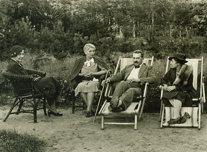 | Nr. inwentarzowy: MŁJ-XVI 1759 / 00 / 059 opis: W ogrodzie siedzą od lewej: Maria Leska (na plecionym fotelu, w ciemnym stroju), Julia Baranowska (na plecionym fotelu, w sukience i narzuconym ciemnym swetrze), Antoni Baranowski (na leżaku, w garniturze, z laską), Wanda Bohdanowicz (na leżaku, w ciemnym stroju i kołnierzu z lisa). W tle klomb, krzewy, drzewa.data: wrzesień 1936 r.czas powstania - daty graniczne: 1936-09-01 - 1936-09-30miejsce: Otwockosoby: Maria Leska 1886-1949 (zd. Olszyńska, żona Juliusza Leskiego, matka Wandy, Anny i Kazimierza Leskich); Julia Baranowska i Antoni Baranowski (rodzeństwo?, małżeństwo? - nazywani "Jula" i "Antek", musieli być zaprzyjaźnieni z Leskimi); Wanda Bohdanowicz 1908-1991 (z domu Leska, córka Juliusza Leskiego i Marii zd. Olszyńskiej, żona Michała Bohdanowicza).tworzywo: papier fotograficzny, półbłyszczącytechnika: odbitka żelatynowo-srebrowa DOP, czarno-białazespół: album rodziny Bohdanowiczówwymiary (wys. x szer.): 59 x 78 [mm]