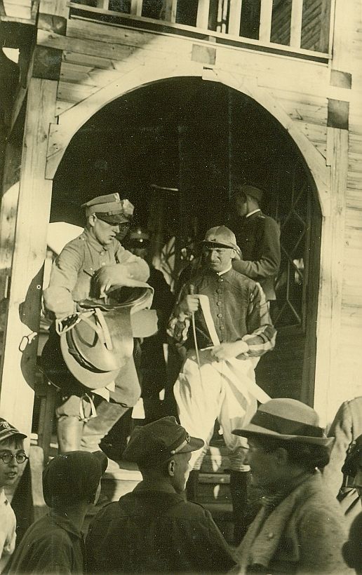 | Nr. inwentarzowy: MŁJ-XVI 1760 / 00 / 037 opis: Tor wyścigów konnych, Bieg na przełaj im. Szefa Departamentu Kawalerii pułkownika Piotra Skuratowicza. Rtm. Michał Bohdanowicz stoi na schodach prowadzących do wagi. Jeździec w stroju wyścigowym I(własne barwy), w rękach trzyma palcat i pas przezkonny (obergurt). Obok żołnierz trzymający siodło. Wokół kilka osób.data: czerwiec 1937 r.czas powstania - daty graniczne: 1937-06-01 - 1937-06-30miejsce: Wilno, Pośpieszkaosoby: Rtm. Michał Bohdanowicz 1903-48 (syn Jana Bohdanowicza i Marii z Cywińskich, brat Heleny i Krystyny, mąż Wandy z domu Leskiej. W latach 1932-36 i przed II wojną w 4 Pułku Ułanów Zaniemeńskich, od 1936 w 13 Pułku Ułanów Wileńskich; nazywany "Misiem". Podczas kampanii wrześniowej trafił do niewoli, zmarł niedługo po powrocie z oflagu).tworzywo: papier fotograficzny, półmatowytechnika: odbitka żelatynowo-srebrowa DOP, tonowana?zespół: album rodziny Bohdanowiczówwymiary (wys. x szer.): 133 x 83 [mm]
