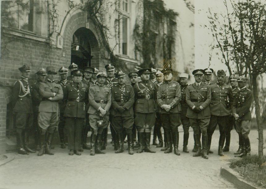opis: ponad dwudziestu oficerów z różnych krajów; grupa ustawiona do zdjęcia przed budynkiem