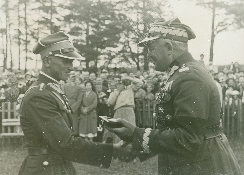 | Nr. inwentarzowy: MŁJ-XVI 1758 / 00 / 088 opis: Tor wyścigów konnych. Rtm. Michał Bohdanowicz odbiera gratulacje i nagrodę od gen. Mariana Przewłockiego. Oficerowie w mundurach. W tle fotograf. drewniany płot, liczna publiczność, drzewa.czas powstania - daty graniczne: 1935-07-18 - 1935-07-18miejsce: Wilno, Pośpieszkaosoby: Rtm. Michał Bohdanowicz 1903-1948 (brat Krystyny i Heleny, mąż Wandy, jeździec wyścigowy); gen. bryg. Marian Przewłocki 1888-1966 (w 1935 r. dowódca 3 Samodzielnej Brygady Kawalerii w Wilnie; prezes Wileńskiego Towarzystwa .Hodowli i Popierania Sportu Konnego).tworzywo: papier fotograficzny, błyszczącytechnika: odbitka żelatynowo-srebrowa DOP, czarno-białazespół: album rodziny Bohdanowiczówwymiary (wys. x szer.): 59 x 82 [mm]