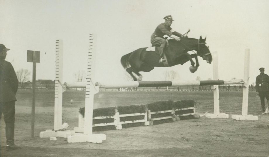 opis: konkursy w Gnieźnie, por. Kazimierz Nieniewski 4 p.s.k. na klaczy Wisła, w skoku przez okser