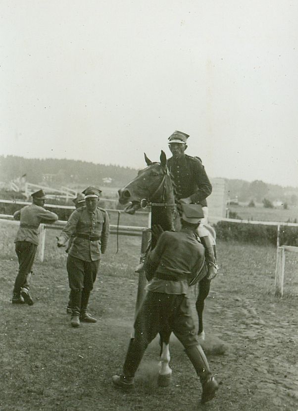 | Nr. inwentarzowy: MŁJ-XVI 1761 / 04 / 029 opis: Tor wyścigów konnych - po biegu na przełaj. W przejściu z bieżni rtm. Michał Bohdanowicz na koniu Żart. Widać czterech żołnierzy, z których jeden zatrzymuje Żarta, prawdopodobnie po to, by go poprowadzić do wagi.data: okres mitingu wyścigowego w Wilnieczas powstania - daty graniczne: 1939-06-18 - 1939-07-02miejsce: Wilno, Pośpieszkaosoby: Rtm. Michał Bohdanowicz 1903-48 (syn Jana Bohdanowicza i Marii z Cywińskich, brat Heleny i Krystyny, mąż Wandy z domu Leskiej. W latach 1932-36 i przed II wojną w 4 Pułku Ułanów Zaniemeńskich, od 1936 w 13 Pułku Ułanów Wileńskich; nazywany "Misiem". Podczas kampanii wrześniowej trafił do niewoli, zmarł niedługo po powrocie z oflagu).tworzywo: papier fotograficzny, błyszczącytechnika: odbitka żelatynowo-srebrowa DOP, czarno-białazespół: album rodziny Bohdanowiczówwymiary (wys. x szer.): 82 x 62 [mm] Koń: 1. Żart IV, maść kasztanowata - Manton xx - Żurna lub Żurka; hod. hr. Korzbok-Łącki, wł. M.S.Wojsk., w 1938 r. startował w biegach na przełaj w Poznaniu pod A. Szamotą; w 1939 r. startował w biegach na przełaj w Wilnie pod M. Bohdanowiczem i St. Chrząszczem