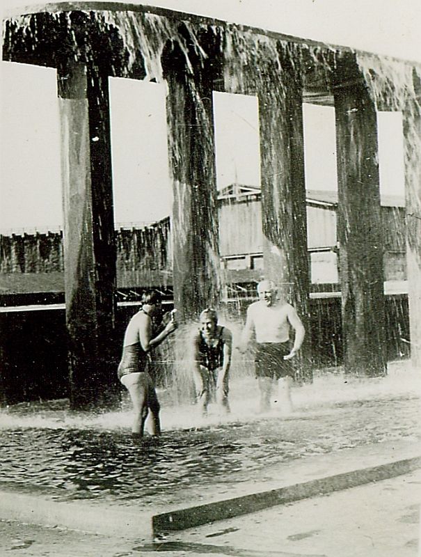 | Nr. inwentarzowy: MŁJ-XVI 1760 / 00 / 034 opis: Kompleks basenów solankowo-termanych, natrysk-fontanna. W płytkim basenie, pod wodą lejącą się z wysokiej konstrukcji (platforma oparta na kolumnach) stoją od lewej: kobieta w kostiumie kąpielowym, Anna Leska (w czepku i kostiumie kąpielowym, trzyma ręce na udach), ppłk Juliusz Gilewicz (w kąpielówkach). W tle prawdopodobnie tężnie i magazyn soli. Relaks w czasie kursu motorowego, w którym udział brała Leska.data: czerwiec 1937 r.czas powstania - daty graniczne: 1937-06-01 - 1937-06-30miejsce: Ciechocinek, Państwowy Zakład Zdrojowyosoby: Anna Leska 1910-98 (pilot szybowcowy i balonowy, ukończyła szkolenie motorowe w 4 p.lot. w Toruniu. II wojna: pilot w Wlk. Bryt.; ppłk lotn. Juliusz Gilewicz 1890-1943 rozstrzelany w Auschwitz (pilot w w wojsku sowieckim, z częścią oddziału przyłączył się do WP i wziął udział w wojnie 1920 r. Później komendant parku w 4 p.lot. w Toruniu, w 1937 przeniesiony w stan spoczynku, praca w PLL „LOT”. II wojna: ZWZ, aresztowany w 1942, w KL Auschwitz w konspiracji wojskowej utworzonej przez rtm. Pileckiego.tworzywo: papier fotograficzny, błyszczącytechnika: odbitka żelatynowo-srebrowa DOP, tonowana?zespół: album rodziny Bohdanowiczówwymiary (wys. x szer.): 59 x 45 [mm]
