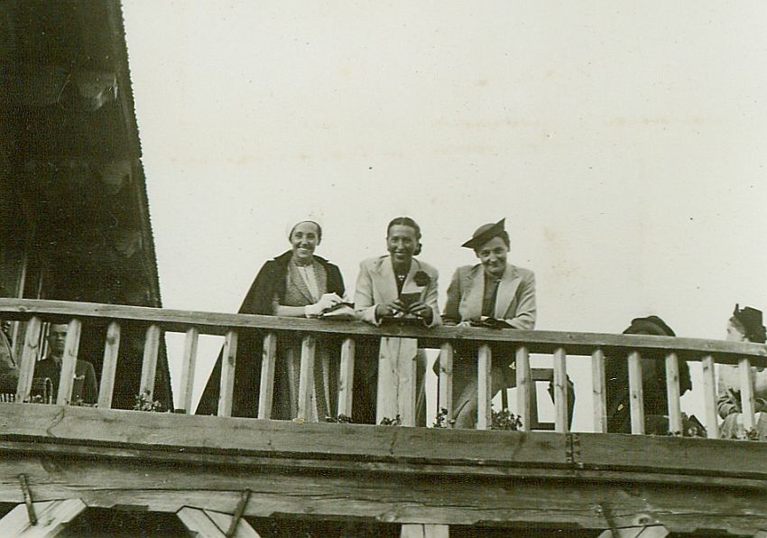 | Nr. inwentarzowy: MŁJ-XVI 1761 / 02 / 017 opis: Tor wyścigów konnych - po wojskowym biegu na przełaj Wiazynia.. Na trybunie uśmiechnięte kobiety, od lewej: Wanda Bohdanowicz, J. Rybicka, H. Pieczyńska.czas powstania - daty graniczne: 1939-06-27 - 1939-06-27miejsce: Wilno, Pośpieszkaosoby: Wanda Bohdanowicz 1908-1991 (z domu Leska, żona rtm. Michała Bohdanowicza); J. Rybicka, H. Pieczyńska.tworzywo: papier fotograficzny, błyszczącytechnika: odbitka żelatynowo-srebrowa DOP, czarno-białazespół: album rodziny Bohdanowiczówwymiary (wys. x szer.): 60 x 84 [mm]