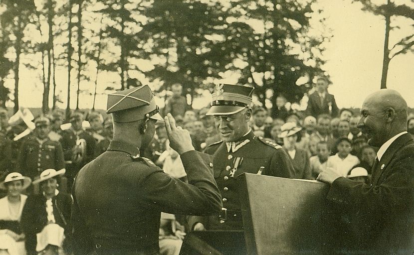 | Nr. inwentarzowy: MŁJ-XVI 1760 / 00 / 026 opis: W 1937 r. rtm. Bohdanowicz był na kursie dowódców szwadronów w CWK w Grudziądzu, znalazł jednak chwilę, bo pokazać się na torze wyścigów konnych w Wilnie. Wygrał na koniu Równy bieg na przełaj im. Szefa Departamentu Kawalerii Płk. Piotra Skuratowicza. Z rąk płk. Skuratowicza i płk. Czesława Kozierowskiego odbiera okazałą nagrodę (duże pudło) i salutuje. Dwaj oficerowie w mundurach, Kozierowski w garniturze. W tle drzewa, liczni kibice.data: okres mitingu wyścigowego w Wilnieczas powstania - daty graniczne: 1937-06-06 - 1937-06-27miejsce: Wilno, Pośpieszkaosoby: Rtm. Michał Bohdanowicz 1903-1948, w latach 1932-36 i przed II wojną służył w 4 p.uł., od 1936 w 13 p.uł. jako dowódca 1 szwadronu "Tatarskiego" [do 15.05.1938]; płk Piotr Skuratowicz 1891-1940 Charków (w latach 1937-39 szef Departamentu Kawalerii w M.S.Wojsk.), płk Czesław Kozierowski 1890-1940 Charków, do 1932 r. dow. 4 p.uł., potem O.T.O., lubiany, popierał sport i wyścigi. inne nazwy własne: O.T.O. = Oficerski Trybunał Orzekającytworzywo: papier fotograficzny, matowytechnika: odbitka żelatynowo-srebrowa DOP, tonowana?zespół: album rodziny Bohdanowiczówwymiary (wys. x szer.): 83 x 132 [mm] Koń: 1. Równy, wałach, rasa: półkrwi, maść skarogniada - po Konwent i Powaga, hod. St. Ciemniewski, wł. rtm. K. Choroszewski. Startowali na nim w biegach na przełaj i steeple-chase M. Bohdanowicz i wł. Żelewski, na zdjęciu: nie ma go na zdjęciu, 1. miejsce