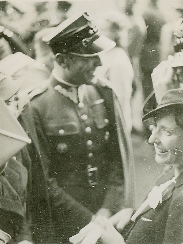 | Nr. inwentarzowy: MŁJ-XVI 1760 / 00 / 048 opis: Janina Szawłowska ( w kapeluszu i ciemnym żakiecie) wśród publiczności podczas konkursów hipicznych w Warszawie. W kadrze tylko części sylwetek. Oprócz kobiety wyraźnie widać oficera (rotmistrza?) i rogatywkę innego wojskowego. data: okres trwania konkursów w Łazienkach, w albumie: czerwiec 1937 r.czas powstania - daty graniczne: 1937-05-27 - 1937-06-07miejsce: Warszawa, hipodrom w Łazienkachosoby: Janina Szawłowska ur. 1910 r. ("Jańcia", żona rtm. Edwarda Szawłowskiego, który zginął w kampanii wrześniowej. W 1940 r. wyszła za mąż za Antoniego Żelewskiego).tworzywo: papier fotograficzny, błyszczącytechnika: odbitka żelatynowo-srebrowa DOP, czarno-białazespół: album rodziny Bohdanowiczówwymiary (wys. x szer.): 55 x 41 [mm]