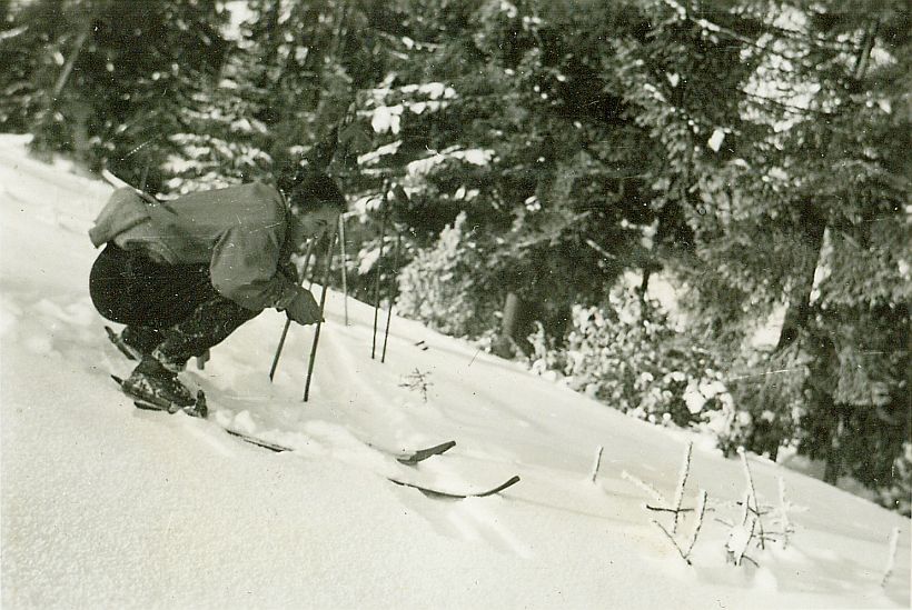 | Nr. inwentarzowy: MŁJ-XVI 1759 / 00 / 071 opis: Anna Leska na nartach. Kobieta w kurtce (drelich?), ciemnych spodniach i butach narciarskich, ze swetrem zawiązanym w pasie. Anna Leska na drewnianych nartach z wiązaniami (kandahar?) kuca i przygląda się czubkom choinek wystającym spod śniegu. Za nią wbite w śnieg dwie pary kijów. Zdjęcie zrobione pod kątem, w rzeczywistości spadek był niewielki, dlatego- mimo ustawienia wzdłuż stoku - kobieta nie zjeżdża.data: styczeń 1937 r.czas powstania - daty graniczne: 1937-01-01 - 1937-01-31miejsce: Bukowinaosoby: Anna Leska 1910-1998 ("Anka", córka Juliusza Leskiego i Marii zd. Olszyńskiej, siostra Wandy i Kazimierza; członkini K.S.R.W.; później Leska-Daab, podczas II wojny światowej pilot w Wielkiej Brytanii).tworzywo: papier fotograficzny, błyszczącytechnika: odbitka żelatynowo-srebrowa DOP, czarno-białazespół: album rodziny Bohdanowiczówwymiary (wys. x szer.): 58 x 85 [mm]