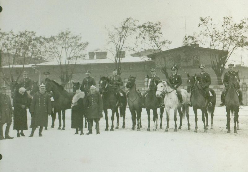opis: 8 oficerów konno, wpięte wstęgi honorowe, 2 konie w ręku, 3 oficerów i 2 damy pieszo, być może III Wyższy Kurs Instruktorów Jazdy Konnej [15.10.1932 - 12.08.1933]