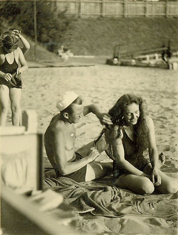 | Nr. inwentarzowy: MŁJ-XVI 1760 / 00 / 030 opis: Na piasku, na kocu lub obszernym szlafroku siedzą: Anna Leska (w krótkiej koszulce i spodenkach) i kpt. pil. Eugeniusz Makowski.(w kąpielówkach i marynarskiej czapeczce). Mężczyzna rozczesuje włosy kobiecie. W tle inne osoby, wejście na plażę. Odpoczynek podczas kursu motorowego, który w Toruniu przechodzi Anna Leska.data: czerwiec 1937 r.czas powstania - daty graniczne: 1937-06-01 - 1937-06-30miejsce: Toruńosoby: Anna Leska 1910-1998 ("Anka", członkini K.S.R.W.; później Leska-Daab, Ukończyła kurs szybowcowy, a następnie szkolenie motorowe (samoloty z silnikiem) w 4 Pułku Lotniczym w Toruniu. W Toruniu przeszła też szkolenie na pilota balonowego. Podczas II wojny światowej pilot w Wlk. Brytanii w Lotniczej Służbie Transportowej (ATA); kpt. pil. Eugeniusz Makowski, 1905-1938 zginął w czasie IV Krajowych Zawodów Szybowcowych w Masłowie (4 p.lot., d-ca 143 Eskadry Myśliwskiej, członek zarządu Aeroklubu Pomorskiego).tworzywo: papier fotograficzny, błyszczącytechnika: odbitka żelatynowo-srebrowa DOP, tonowana?zespół: album rodziny Bohdanowiczówwymiary (wys. x szer.): 60 x 47 [mm]