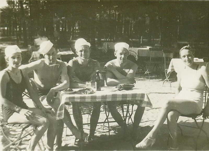| Nr. inwentarzowy: MŁJ-XVI 1760 / 00 / 016 opis: Po obiedzie na terenie kąpieliska nad Rudnikiem. Przy stole, na składanych krzesłach siedzą od lewej: Wanda Bohdanowiczowa (w ciemnym kostiumie kąpielowym), rtm. Stanisław Czerniawski, por. Józef Kozicki, por. Antoni Żelewski, Janina Szawłowska (w chustce i jasnym kostiumie kąpielowym). Mężczyźni w kąpielówkach i jasnych czapeczkach marynarskich. W tle stoliki, zagajnik.data: czerwiec 1937 r.czas powstania - daty graniczne: 1937-06-01 - 1937-06-30miejsce: Grudziądz, plaża nad jeziorem Rudnikosoby: Wanda Bohdanowicz 1908-91 (żona rtm. Bohdanowicza); rtm. Stanisław Czerniawski 1905-39 (17 p.uł., jeździec klasy międzynarodowej, instruktor, rezerwowy skoczek na IO 1936, w grupie olimpijskiej na IO 1940); por. Józef Kozicki 1909-80 (23 p.uł., jeździec klasy krajowej); Janina Szawłowska ur. 1910 r. ("Jańcia", żona rtm. E. Szawłowskiego, który zginął w kampanii wrześniowej, w 1940 r. wyszła za mąż za Antoniego Żelewskiego); por. Antoni Żelewski 1905-94 (8 p.uł., jeździec klasy międzynarodowej, instruktor).tworzywo: papier fotograficzny, półbłyszczącytechnika: odbitka żelatynowo-srebrowa DOP, czarno-białazespół: album rodziny Bohdanowiczówwymiary (wys. x szer.): 59 x 82 [mm]