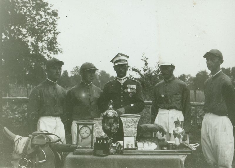| Nr. inwentarzowy: MŁJ-XVI 1761 / 03 / 027 opis: Tor wyścigów konnych - pod koniec lub po sezonie wyścigowym w Wilnie. Zespół c Centrum Wyszkolenia Kawalerii w Grudziądzu, opisany w albumie jako "najgroźniejsza nasza konkurencja". Trener rtm. Bolesław Pieczyński (w środku, w mundurze i okularach). Jeźdźcy (porucznicy w barwach CWK - k. granatowa z poprzecznym amarantowym pasem, r. i cz. amarantowe): z lewej: Tadeusz Wojnarowski i Jan Szmigiero, z prawej: Jan Jaroszewicz i Roman Rożałowski. Na stole i obok nagrody. data: koniec podanego okresu (widać zdobyte nagrody)czas powstania - daty graniczne: 1939-07-02 - 1939-07-02miejsce: Wilno, Pośpieszkaosoby: Rtm. Bolesław Pieczyński ur. 1893 (16 p.u., CWK, jeździec sportowy i wyścigowy,trener); por. Tadeusz Jan Wojnarowski 1907-61 zm. tragicznie w Argentynie (9 p.u., PSZ); por. Jan Józef Szmigiero 1904-83 Stany Zjedn. (9 p.s.k.); por. Jan Jaroszewicz (przed II wojną w Dywizjon Rozpoznawczy 10 BK); por. Roman Rożałowski 1913-84 (15 p.u., ranny we wrześniu 1939, jako inwalida w AK, ponownie ciężko ranny w powstaniu warszawskim).tworzywo: papier fotograficzny, błyszczącytechnika: odbitka żelatynowo-srebrowa DOP, czarno-białazespół: album rodziny Bohdanowiczówwymiary (wys. x szer.): 59 x 83 [mm]