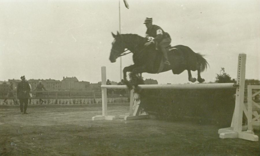 opis: konkursy w Gnieźnie, por. Kazimierz Nieniewski 4 p.s.k. na wałachu Sawannah, w skoku przez hyrdę ze stacjonatą; numer startowy na ramieniu jeźdźca: 6