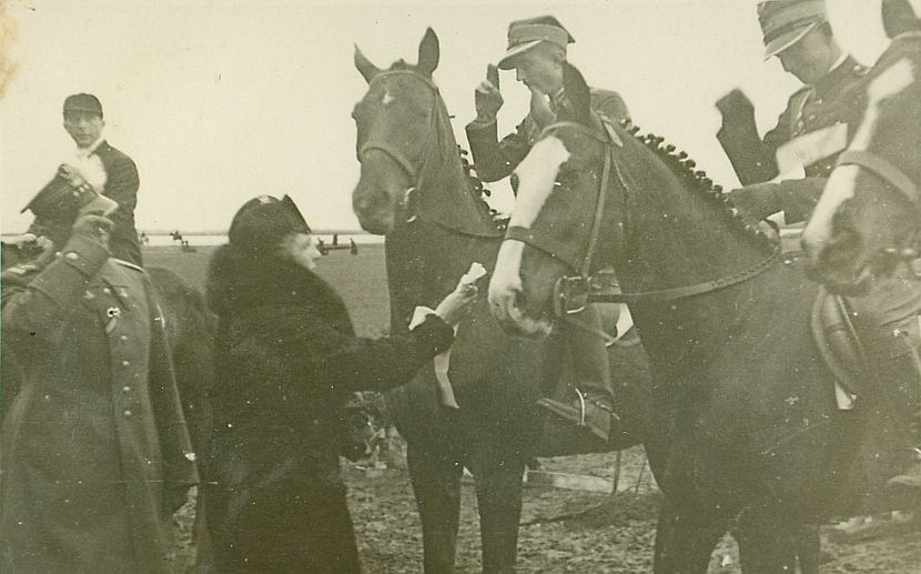 | Nr. inwentarzowy: MŁJ-XVI 1760 / 00 / 008 opis: Konkursy Pomorskiego Towarzystwa Zachęty do Hodowli Koni. Dekoracja po konkursie. Widać fragmenty sylwetek czterech koni i trzech jeźdźców. Przed nimi pułkownik w mundurze i kobieta w ciemnym stroju. Dekorowany jest koń oficera, który salutuje - w jego kierunku kobieta wyciąga nagrodę lub wstęgę honorową. Salutuje także pułkownik. Z lewej jeździec cywilny, z prawej rtm. Michał Bohdanowicz na koniu Talar III – X miejsce.czas powstania - daty graniczne: 1937-04-22 - 1937-04-24miejsce: Grudziądzosoby: Rtm. Michał Bohdanowicz 1903-48 (syn Jana Bohdanowicza i Marii z Cywińskich, brat Heleny i Krystyny, mąż Wandy z domu Leskiej. W latach 1932-36 i przed II wojną w 4 Pułku Ułanów Zaniemeńskich, od 1936 w 13 Pułku Ułanów Wileńskich; nazywany "Misiem". Podczas kampanii wrześniowej trafił do niewoli, zmarł niedługo po powrocie z oflagu).tworzywo: papier fotograficzny, błyszczącytechnika: odbitka żelatynowo-srebrowa DOP, czarno-białazespół: album rodziny Bohdanowiczówwymiary (wys. x szer.): 55 x 87 [mm] Koń: 1. Talar III, wałach, maść kasztanowata - hod. Bogumiła Hebanowskiego; ur. przed 1928, prywatny koń Michała Bohdanowicza, który startował na nim w konkursach ujeżdżenia, skoków (np. Mitingi Popularne PZJ 1938-39 i WKKW ("Militari"), biegach myśliwskich, skiringu, uczestniczył w ćwiczeniach wojskowych. Dosiadała go też żona Michała - Wanda (m.in. w 1937 r. w Grudziądzu).., na zdjęciu: 10. miejsce