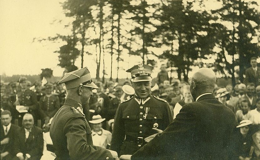| Nr. inwentarzowy: MŁJ-XVI 1760 / 00 / 027 opis: W 1937 r. rtm. Bohdanowicz był na kursie dowódców szwadronów w CWK w Grudziądzu. Znalazł jednak czas, by wygrać na koniu Równy na torze wyścigowym w Wilnie bieg na przełaj im. Szefa Departamentu Kawalerii Płk. Piotra Skuratowicza. Bohdanowicz odbiera gratulacje od płk. Piotra Skuratowicza i płk. Czesław Kozierowskiego (widać "13" na naramienniku). Dwaj oficerowie w mundurach, Kozierowski w garniturze. W tle drzewa, liczni kibice.data: okres mitingu wyścigowego w Wilnieczas powstania - daty graniczne: 1936-04-01 - 1938-10-31miejsce: Wilno, Pośpieszkaosoby: Rtm. Michał Bohdanowicz 1903-1948, w latach 1932-36 i przed II wojną służył w 4 p.uł., od 1936 w 13 p.uł. jako dowódca 1 szwadronu "Tatarskiego" [do 15.05.1938]); płk Piotr Skuratowicz 1891-1940 Charków (w latach 1937-39 szef Departamentu Kawalerii w M.S.Wojsk.), płk Czesław Kozierowski 1890-1940 Charków, do 1932 r. dow. 4 p.uł., potem O.T.O., lubiany, popierał sport i wyścigi. inne nazwy własne: O.T.O. = Oficerski Trybunał Orzekającytworzywo: papier fotograficzny, matowytechnika: odbitka żelatynowo-srebrowa DOP, tonowana?zespół: album rodziny Bohdanowiczówwymiary (wys. x szer.): 82 x 132 [mm] Koń: 1. Równy, wałach, rasa: półkrwi, maść skarogniada - po Konwent i Powaga, hod. St. Ciemniewski, wł. rtm. K. Choroszewski. Startowali na nim w biegach na przełaj i steeple-chase M. Bohdanowicz i wł. Żelewski, na zdjęciu: nie ma go na zdjęciu, 1. miejsce