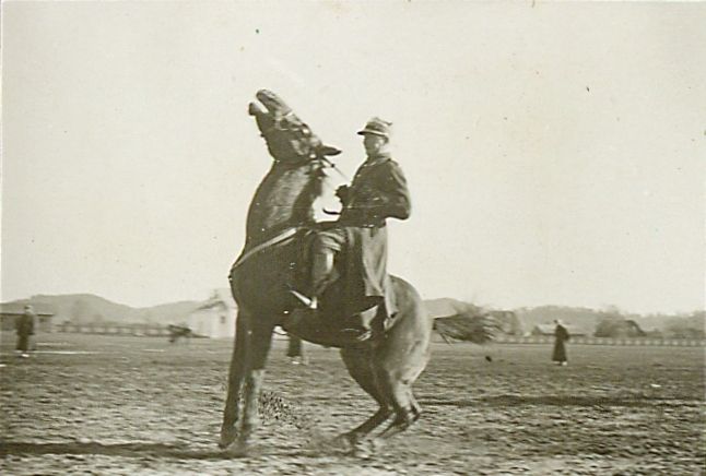 Nr. inwentarzowy: MŁJ-XVI 1759 / 00 / 025 opis: Bieg św. Huberta w 4 Pułku Ułanów Zaniemeńskich. Duży plac, na środku oficer w płaszczu mundurowym walczy z koniem (zwierzę usiłuje się wspiąć, człowiek ściąga wodze. W tle kilka osób, zabudowania, pagórki.czas powstania - daty graniczne: 1935-11-03 - 1935-11-03miejsce: Wilnotworzywo:papier fotograficzny, błyszczącytechnika:odbitka żelatynowo-srebrowa DOP, czarno-białazespół:album rodziny Bohdanowiczówwymiary (wys. x szer.): 26 x 33 [mm]