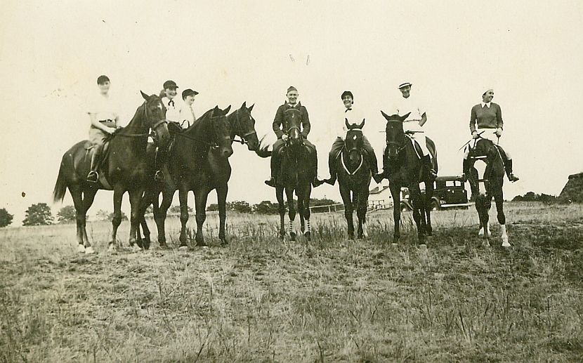 | Nr. inwentarzowy: MŁJ-XVI 1760 / 00 / 023 opis: W szeregu do zdjęcia pozują konno amazonki z Klubu Sportowego Rodziny Wojskowej, które oglądały tor terenowych przeszkód przygotowany dla nich przed zawodami przeprowadzanymi w Centrum Wyszkolenia Kawalerii celu zdobycia Polskiej Odznaki Jeździeckiej. W środku por. Burdziłowski (w mundurze), po obu stronach po trzy kobiety. Wanda Bohdanowicz (w jasnym berecie i ciemnym swetrze) siedzi na koniu Talar III. W tle drzewa, dom, samochód.data: czerwiec 1937 r.czas powstania - daty graniczne: 1937-06-01 - 1937-06-30miejsce: Grudziądzosoby: Por. Burdziłowski; Wanda Bohdanowicz 1908-1991 (z domu Leska, żona rtm. Michała Bohdanowicza, miłośniczka sportów konnych, wyścigów).tworzywo: papier fotograficzny, błyszczącytechnika: odbitka żelatynowo-srebrowa DOP, tonowana?zespół: album rodziny Bohdanowiczówwymiary (wys. x szer.): 56 x 86 [mm] Koń: 1. Talar III, wałach, maść kasztanowata - hod. Bogumiła Hebanowskiego; ur. przed 1928, prywatny koń Michała Bohdanowicza, który startował na nim w konkursach ujeżdżenia, skoków (np. Mitingi Popularne PZJ 1938-39 i WKKW ("Militari"), biegach myśliwskich, skiringu, uczestniczył w ćwiczeniach wojskowych. Dosiadała go też żona Michała - Wanda (m.in. w 1937 r. w Grudziądzu)..