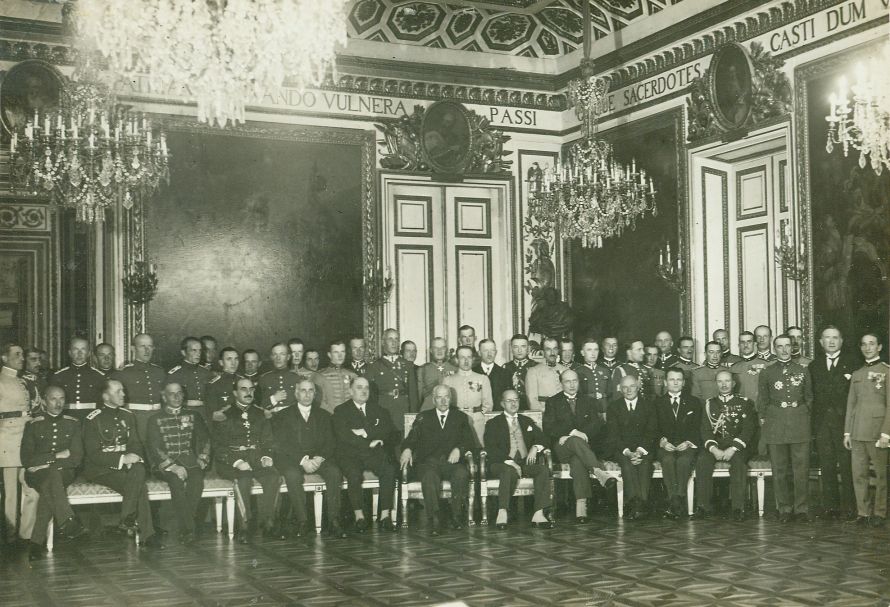 opis: Międzynarodowe Konkursy Hipiczne. U prezydenta Mościckiego (1 rząd, w środku). Kilkadziesiąt osób, organizatorów i uczestników, gł. oficerowie. 1. rząd (siedzą na fotelach) od lewej: 5. Jurjewicz, 9. Zaleski, 12. Rómmel; stoją: Orlicz-Dreszer (na lewo od prezydenta), Kon (5. z prawej).
