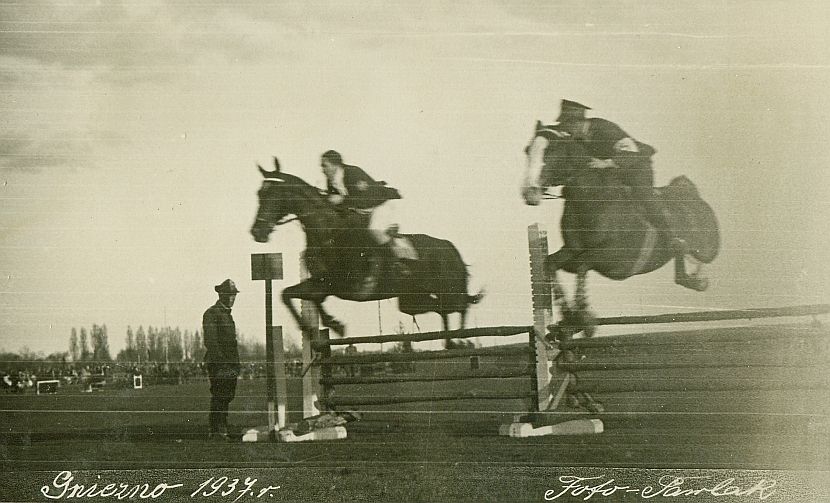| Nr. inwentarzowy: MŁJ-XVI 1760 / 00 / 061 opis: Konkursy hipiczne w Gnieźnie - Konkurs Parami, zwykły. W równoległym skoku przez stacjonatę: Wanda Bohdanowicz (strój konkursowy, goła głowa) na koniu Kazik i por. Janusz Komorowski (w mundurze) na koniu Zbój IV. Para zdobyła wstęgę honorową. Widać stojak dzielący przeszkodę w połowie, tabliczkę z numerem (tyłem). Przy przeszkodzie stoi żołnierz. W tle publiczność, topole. Na dole napis: Gniezno 1937 r. Foto-Pawlak.data: dzień rozegrania konkursu paramiczas powstania - daty graniczne: 1937-05-03 - 1937-05-03miejsce: Gnieznoosoby: Wanda Bohdanowicz 1908-1991 (z domu Leska, córka Juliusza Leskiego i Marii zd. Olszyńskiej, siostra Anny i Kazimierza, żona Michała Bohdanowicza, miłośniczka sportów konnych, wyścigów); por. Janusz Komorowski 1905-1993 (1 p.u., wybitny jeździec - skoczek, olimpijczyk z 1936 r., trener, w kampanii wrześniowej trafił do niewoli, walczył w armii gen. Andersa, wieloletnia emigracja w Argentynie).tworzywo: papier fotograficzny, półbłyszczącytechnika: odbitka żelatynowo-srebrowa DOP, tonowana?zaklad: Foto-Pawlak, Gnieznozespół: album rodziny Bohdanowiczówwymiary (wys. x szer.): 80 x 130 [mm]