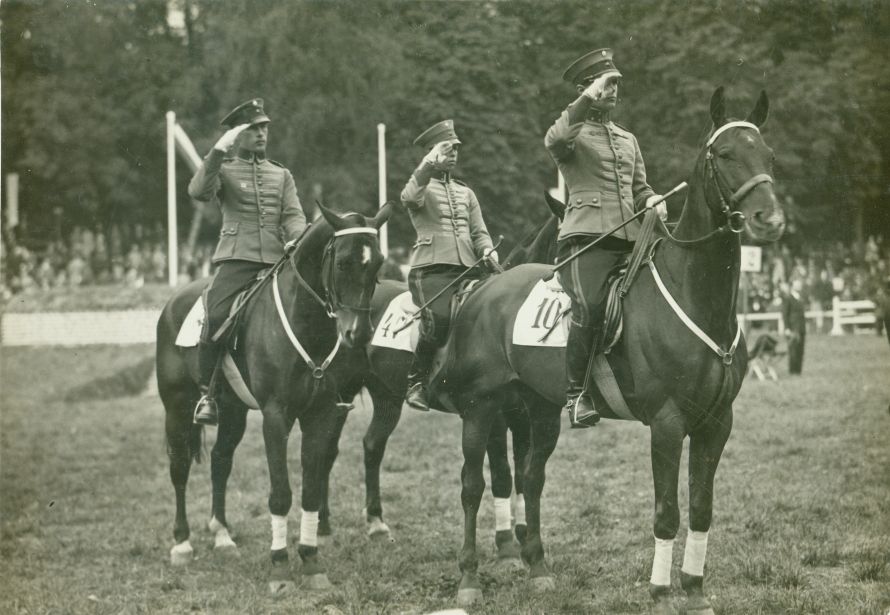 opis: Międzynarodowe Konkursy Hipiczne, płyta hipodromu - ekipa Finlandii podczas prezentacji (2 jeźdźców w szeregu i szef ekipy z przodu, siedzą na koniach, salutują). Konie mają zabandażowane przednie nadpęcia, na potniku pierwszego konia nr 10.
