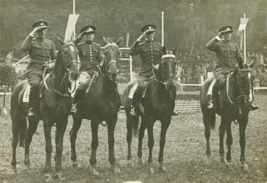 opis: Międzynarodowe Konkursy Hipiczne, płyta hipodromu - ekipa Czechosłowacji podczas prezentacji (4 jeźdźców na koniach, salutują), prawdopodobnie jest wśród nich wybitny zawodnik, później działacz rtm. František Ventura